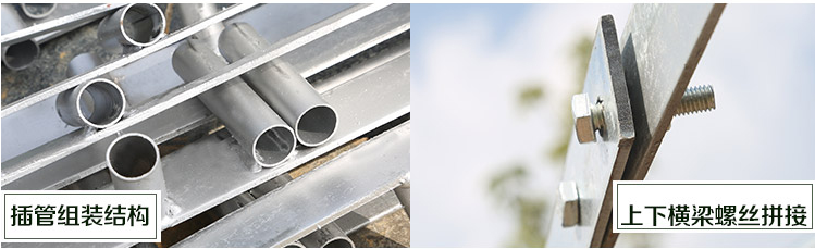 2.一个人拿着套脑(带有些插头的插圈),用斜梁管链接套脑和扁铁,长的是斜梁,短点的是立柱。先插套脑后插扁铁,斜梁和上扁铁链接有点不好进的情况,不用担心,用扳手打上扁铁就进去了。