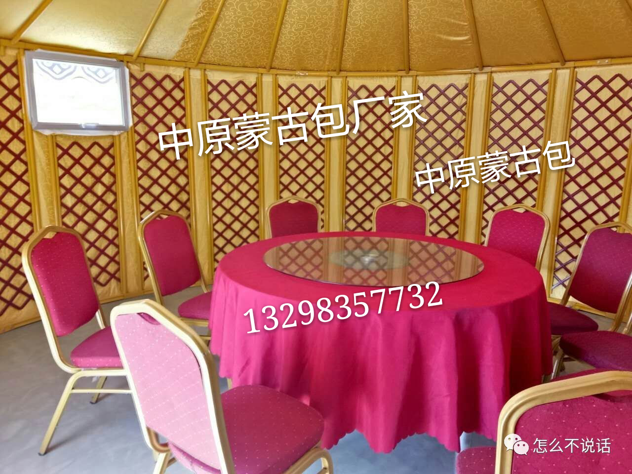 内部采用精装修,骨架为金黄色烤漆钢架结构,颜色鲜亮不生锈不掉漆;内饰红色网格编制的精美哈那墙美观实用,起加固和装饰作用;最里面一层为金黄色特质提花窗帘布装饰,耐磨,耐脏,耐水,平整美观,起装饰作用。