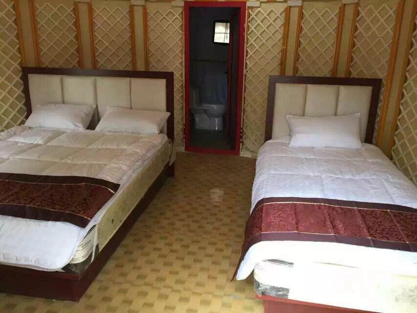 住宿蒙古包:新款奥松板蒙古包,生态竹艺蒙古包,豪华钢塑蒙古包适合用于住宿,款式新颖,里面装饰哈那墙美观大方,节约装修成本,游客住着舒心。住宿款一般采用直径5米,6米包,可以放两张双人床,供一家人住宿。