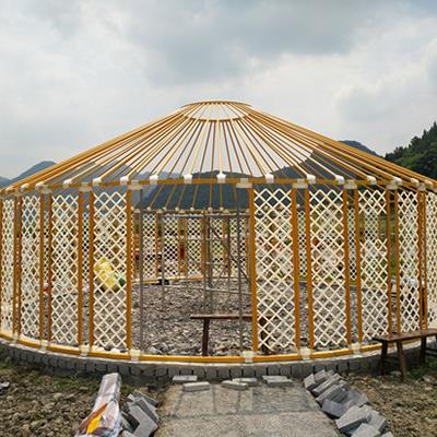 现在的蒙古包材质都是钢架结构,当然是不惧任何大风的,承大风的问题也就没必要了。那如果台风来了我们建议作一个固定,比如铁链、绳子之类的跟蒙古包四个方位的立柱绑定,然后固定在地面或者墙上,这样的话6-7级的大风是完全可以承受住的。