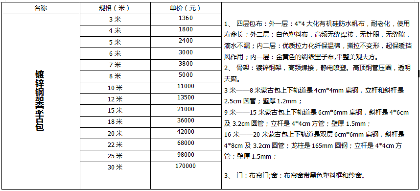蒙古包价格表: