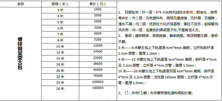 网站首页>欢迎进入万彩网1862近期很多朋友来电咨询大型蒙古包价格?其实这个问题很难回答,蒙古包大型的尺寸有10米——50米,而且材质不一样价格也不一样,那么大型蒙古包价格是多少呢?今天小编搜集中远 蒙古包价格表供大家做参考。希望对大家有所帮助!